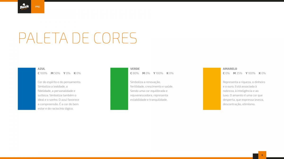 Neste manual deverão conter os códigos das cores nos formatos CMYK (Cyan, Magenta, Yellow e Black) para aplicações em materiais impressos, RGB (Red, Green e Blue) para aplicações em materiais digitais, e a melhor aproximação na escala PANTONE ®, para quando for necessário a utilização para impressão em uma única cor, como por exemplo, em embalagens de sacos plásticos, que fazem uso de cores puras para comunicação.
